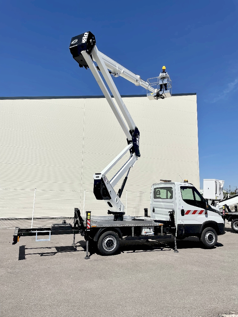 Cette nacelle vous offre la possibilité d’opérer en zones difficiles grâce à sa stabilisation dans le gabarit porteur, vous permettant ‘opérer en toute sécurité même en bord de route. Sa hauteur de travail en fait la nacelle la plus performante de notre gamme sur VL. Son bras articulé à double pantographe est idéalement conçu pour les travaux de toiture, de peinture, de nettoyage de vitrage, ou d’élagage.